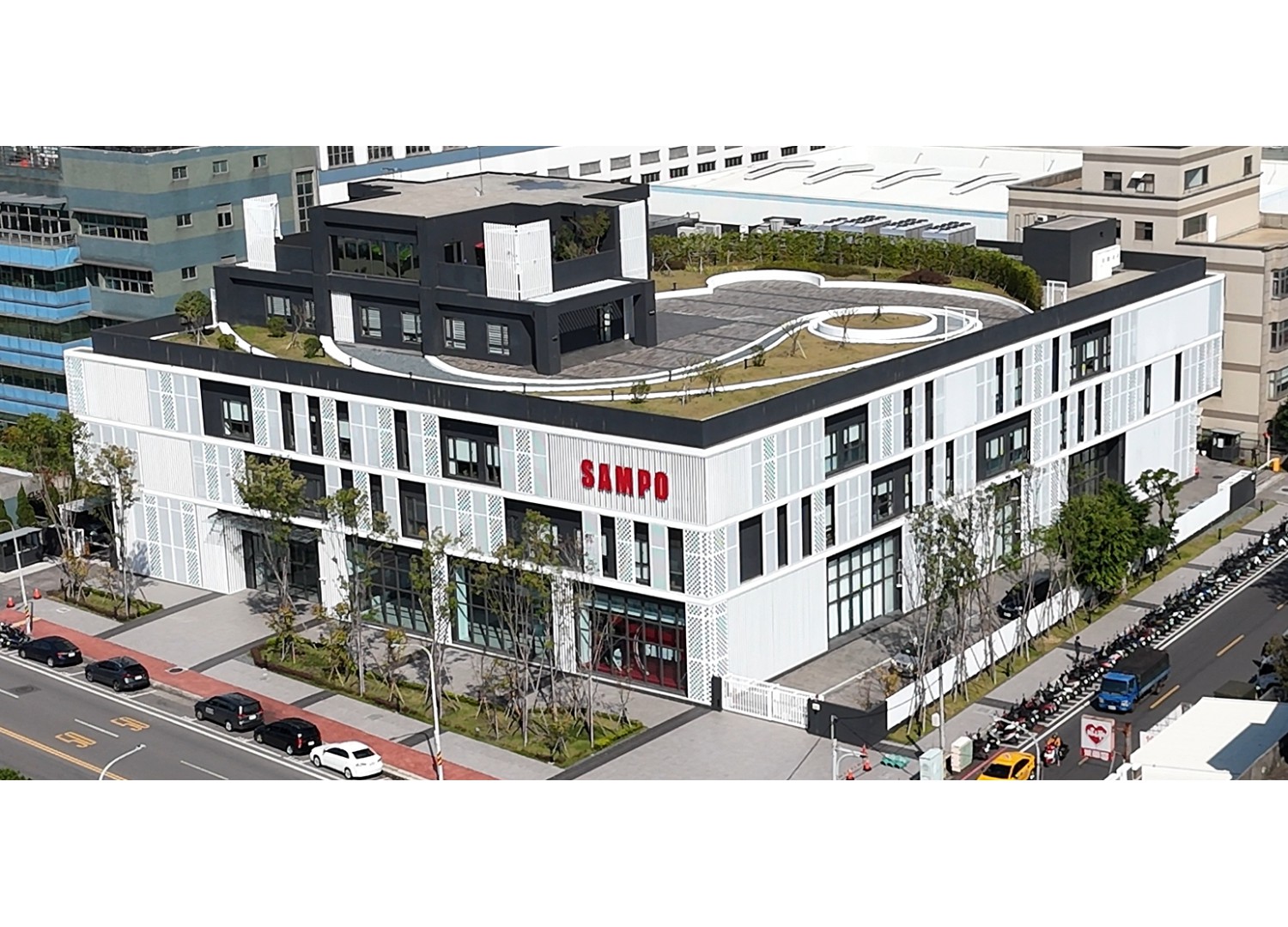 外觀採用塗料無貼磚、以沖孔板點綴達到遮陽及裝飾之效果,充分表達本棟建築物之設計工業風格調。屋頂景觀設計造型獨特,達到空中花園之效果。